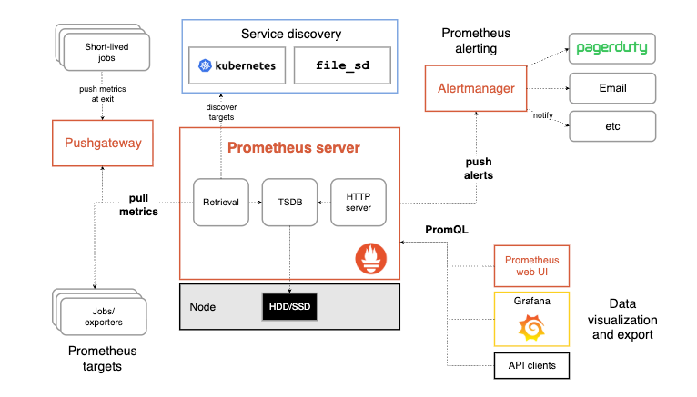 Prometheus is an open-source monitoring tool used to collect and process time-series metrics. It gathers numeric data together with labels and timestamps, then stores them for querying and analysis. Prometheus collects metrics by scraping HTTP endpoints that expose metrics data. These endpoints, called targets, can be infrastructure platforms such as Kubernetes, applications, or services like databases. It supports metric collection, querying, and alerting, and is commonly used together with Alertmanager to send and manage alerts. In Kubernetes environments, Prometheus is often set up with the kube-prometheus-stack to simplify installation and configuration.