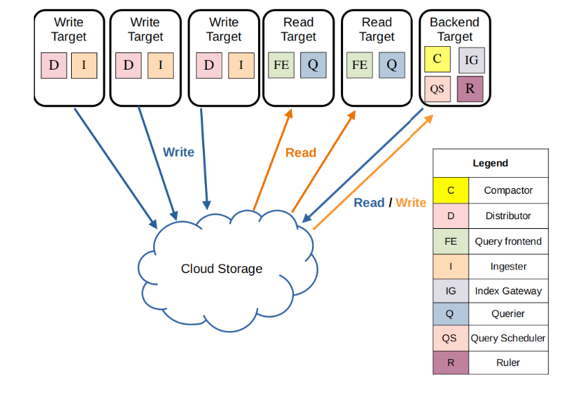 Simple Scalable: Loki’s simple scalable deployment mode separates execution paths into read, write, and backend targets. The simple, scalable deployment mode can scale close to a TB of logs per day.