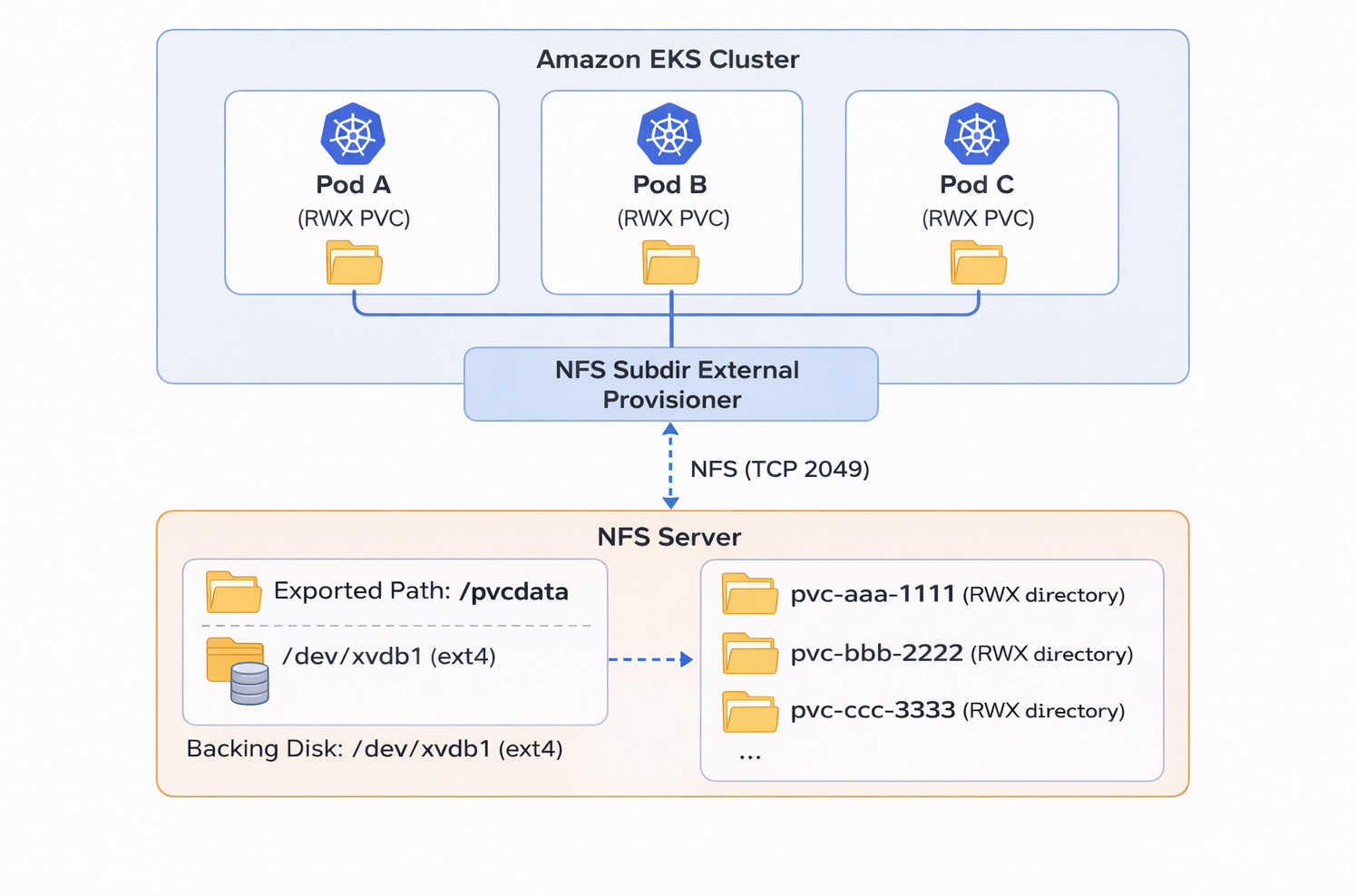 Before deploying the NFS Subdir External Provisioner on EKS, we first need a fully functional NFS server. This server will act as the backend storage for all dynamically created PVC directories.